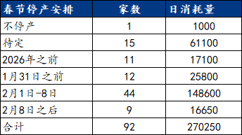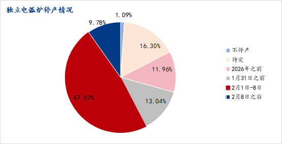 根據(jù)調(diào)研95家獨(dú)立電弧爐鋼廠情況來看,僅有一家過年期間不停產(chǎn)。有11家在2026年之前就已經(jīng)停產(chǎn),占11.96%。停產(chǎn)的主要原因除個別自身生產(chǎn)原因以外,主要以西北、東北的鋼廠為主。西北、東北的市場基本休市,鋼廠沒利潤的情況下,提前停產(chǎn)。